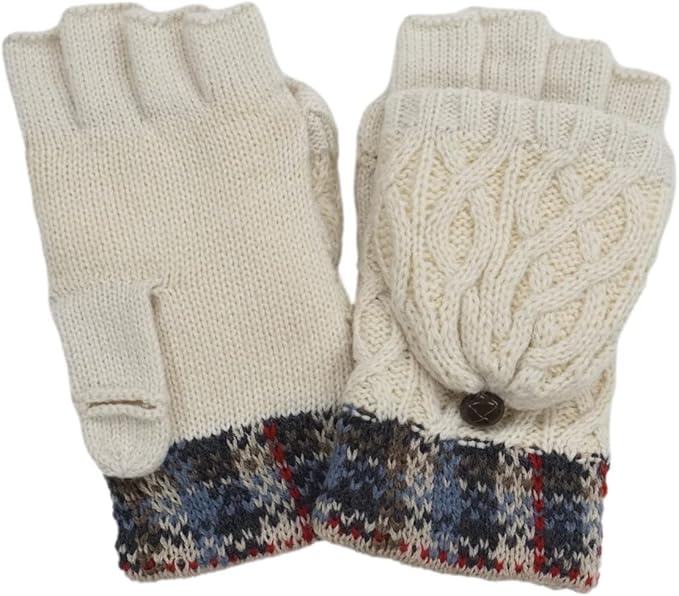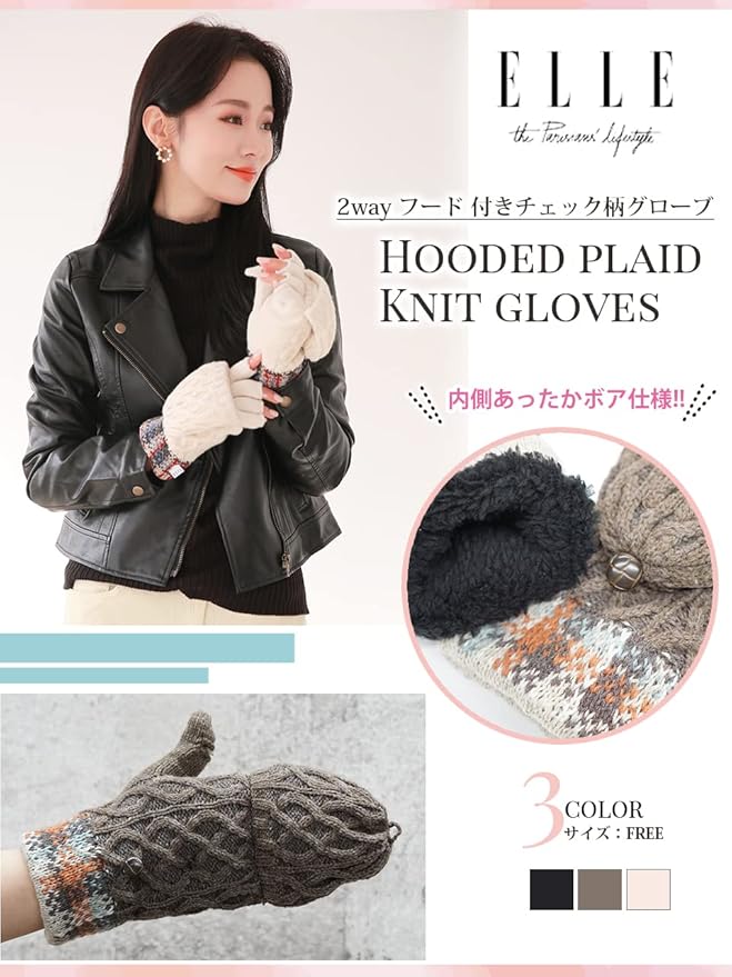 [エル] 2way フード 付き ケーブル 編み チェック柄 ニット 手袋 ミトン 指切 フィンガーレス レディース クリスマス プレゼント ギフト ケース付き