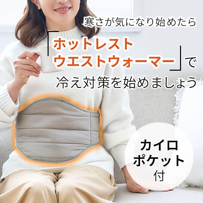 お家でホッと!部分あたため。お腹・腰をあたためて心地よく!綿入りでふんわり。服の上からも装着OK。カイロポケット付なので、お手持ちのカイロを入れてあたたかさパワーUP!内側は起毛生地使用。面ファスナーで着脱簡単!ホットレストシリーズには、他にも首・肩・背中用もあります。