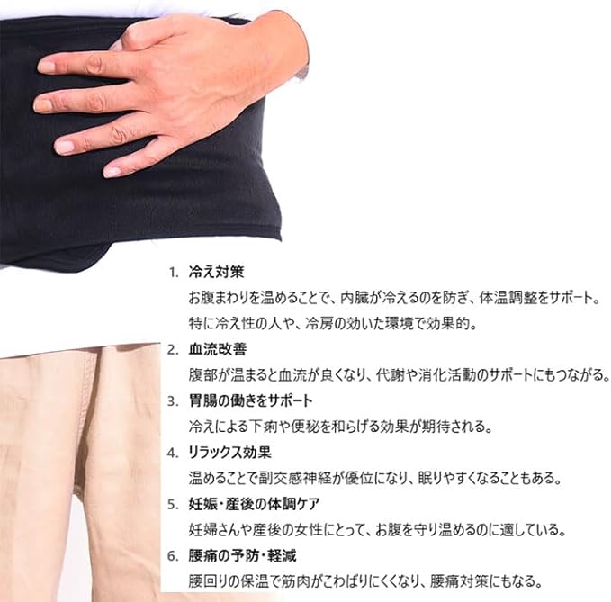 お腹まわりを温めることで、内臓が冷えるのを防ぎ、体温調整をサポート。
