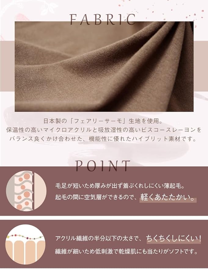 ✅【ポカポカあったか持続】保温性・吸放湿性に優れた、日本製「フェアリーサーモ生地」使用。マイクロアクリルとビスコースレーヨンを掛け合わせたハイブリッド素材が温かさを持続します。