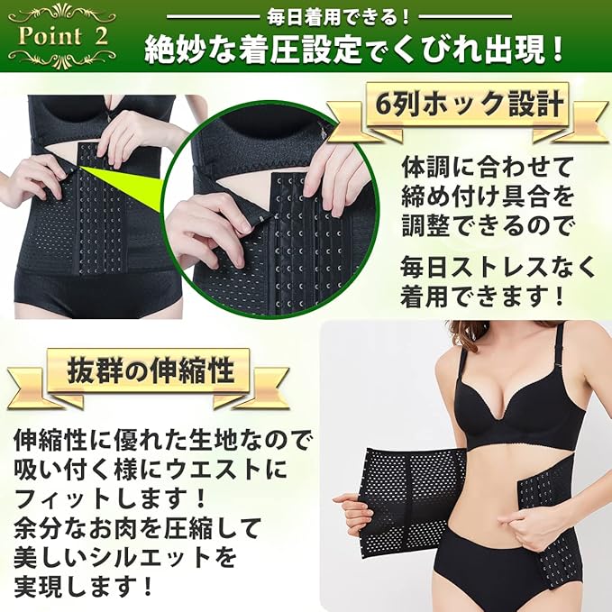 6段階のホックライン設計で体型に合わせて自由に調節、また形状記憶の合金ボーンがボディメイクをサポート。