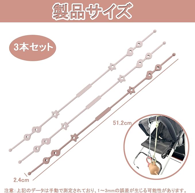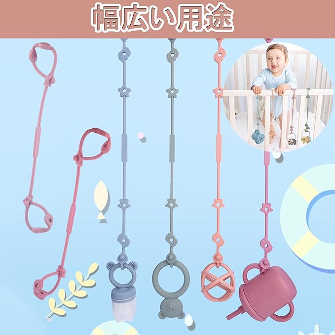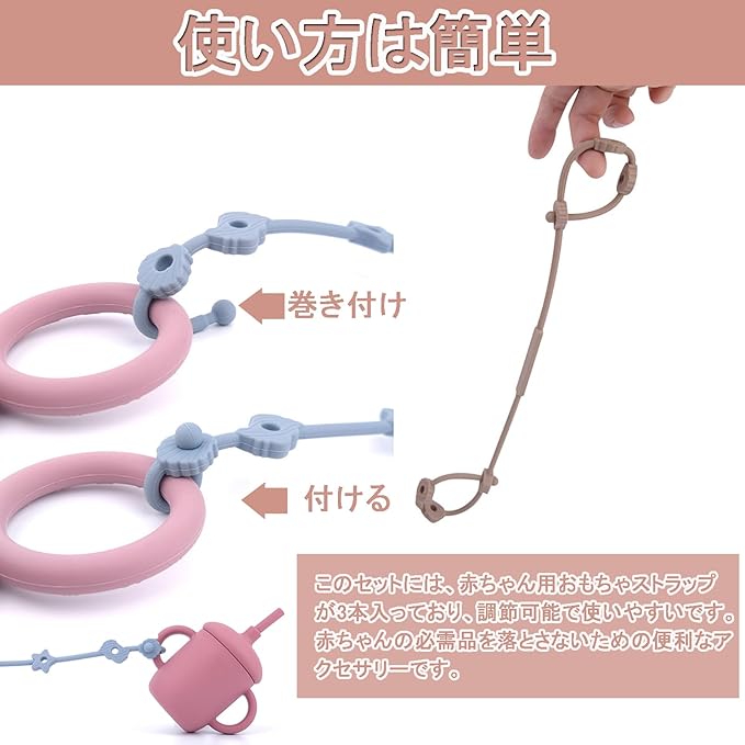 【おもちゃストラップ 3本セット】このセットには、赤ちゃん用おもちゃストラップが3本入っており、調節可能で使いやすいです。赤ちゃんの必需品を落とさないための便利なアクセサリーです。【サイズ】長さ512mm、幅24mm、8mm厚。