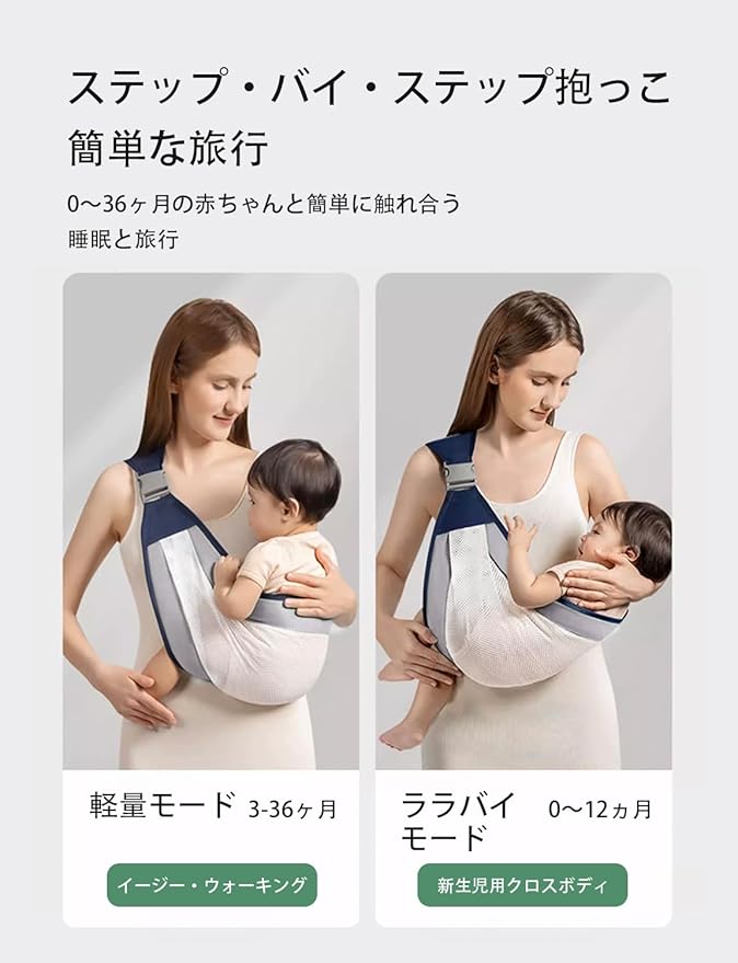 【持ち運びが簡単】当社の新生児用ベビーキャリアは、コンパクトで軽量に設計されており、どこにでも持ち運ぶことができて便利です。 小さく折りたたんでバッグやスーツケースに入れられるので、場所を取りません。 ご自宅でも、公園でも、旅行先でも、簡単にお使いいただけます。