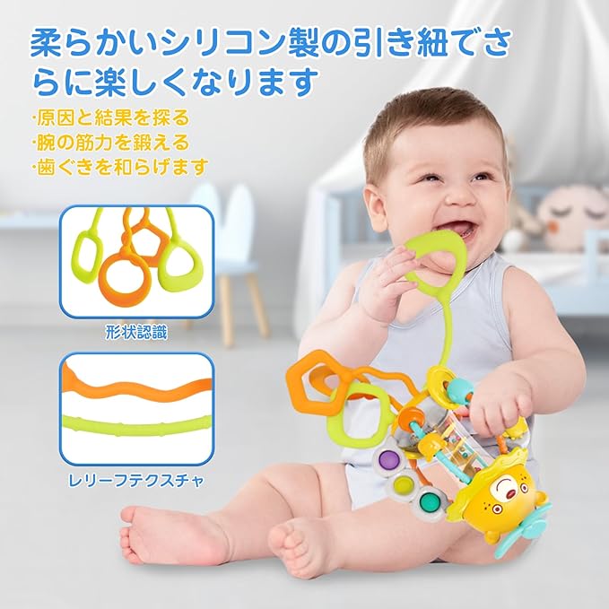 【赤ちゃん 紐 玩具】おもちゃには、異なる質感の 2 本の引き紐と、異なる形状の 4 つのプルタブが付属しているので、赤ちゃんはすべての紐を一方の側からもう一方の側に引っ張って原因と結果を探ることができます。柔らかく伸縮性のあるシリコン製のひもおもちゃで、赤ちゃんは安全に色や形を探索できます。チュアブル素材なので、赤ちゃんの歯が生えるおもちゃに最適です。