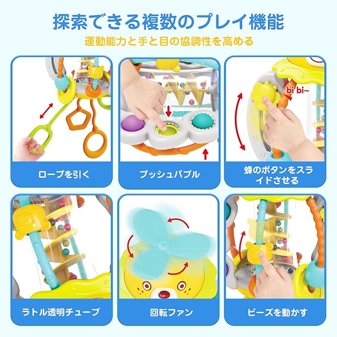 さまざまな興味深いアクティビティが赤ちゃんに豊かな感覚体験を提供します。回転:赤ちゃんは上にある風車のおもちゃを簡単に回転させることができます。押す:3つのシリコンバブルおもちゃは簡単に押すことができます。スライド:ハチの形をしたボタンをスライドさせると音が鳴り、赤ちゃんを引き寄せます。引く:4本のシリコンコードで小さな手でも引っ張れます。振る:おもちゃを振るとガラガラ音が鳴ります。お子様が遊べるように、さまざまな形のビーズもあります。