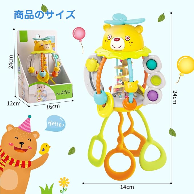 【知育玩具】滑らせる、回転させる、押すなどの動きは、赤ちゃんの腕の力を鍛え、細かい運動能力を発達させるのに役立ちます。かわいいクマやミツバチなどの形とカラフルなデザインがお子様の注意を引き、視覚の発達を刺激します。さまざまな興味深い音がお子様の聴覚の発達を刺激します。さらに、当社のおもちゃには、お子様の触覚の発達を大いに促進する、レリーフやテクスチャーのデザインが数多く組み込まれています。