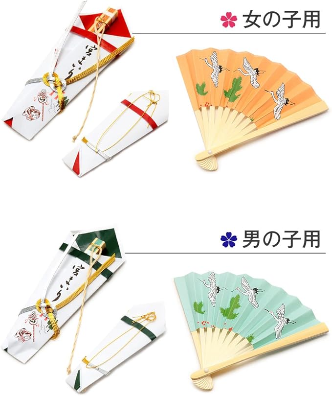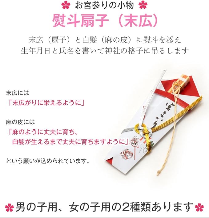 末広(扇子)には「末広がりに栄えるように」、白髪(麻の皮)には「麻のように丈夫に育ち、白髪が生えるまで丈夫に育ちますように」という願いが込められています。