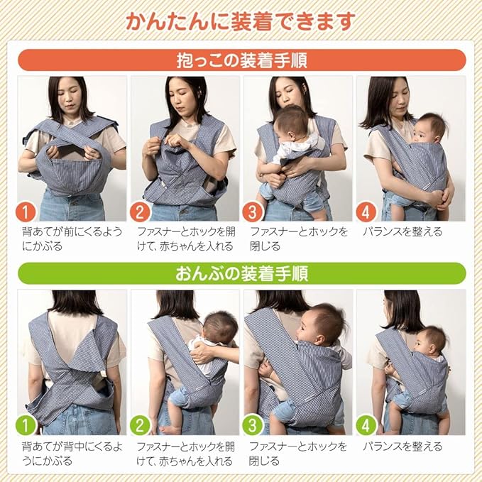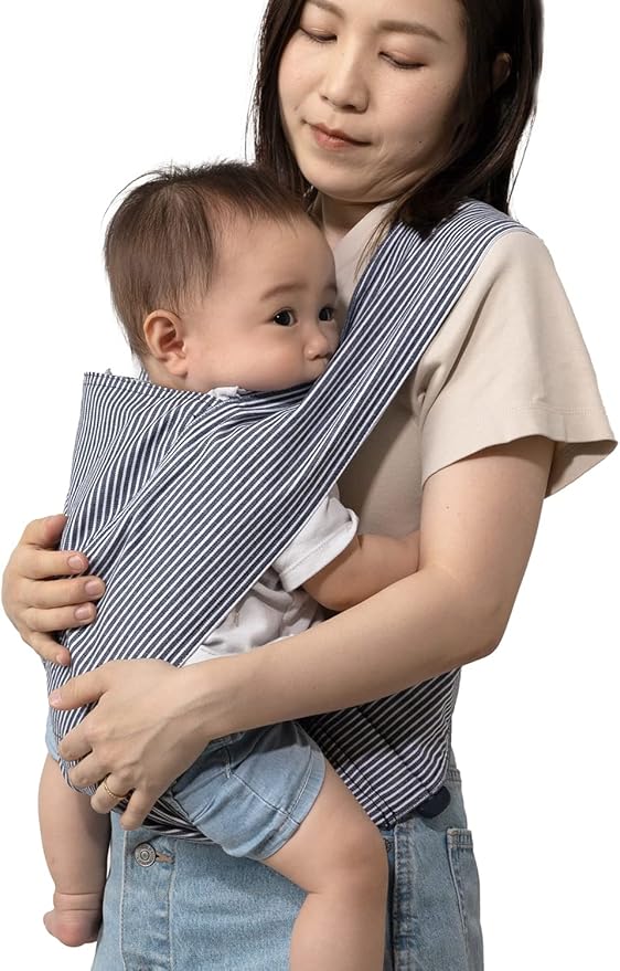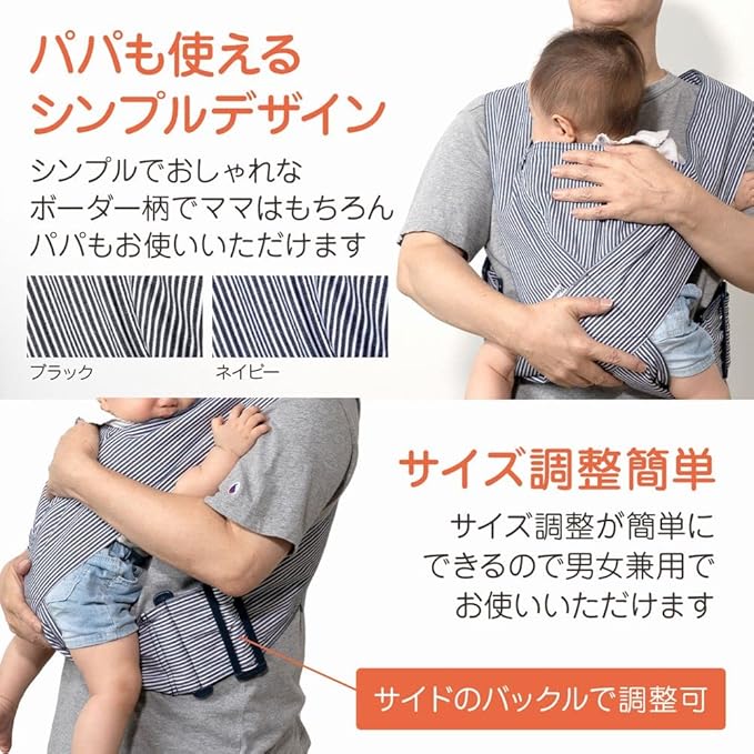 【サイズ調整可/パパも使えるシンプルデザイン】 落ち着いたネイビーのボーダー柄で男女問わずお使いいただけます。普段着はもちろん、通勤着などでも合わせやすく毎日大活躍できます。パパも恥ずかしくないデザインと体型に合わせてサイズ調整できるので、ママからパパに抱っこチェンジも可能です。
