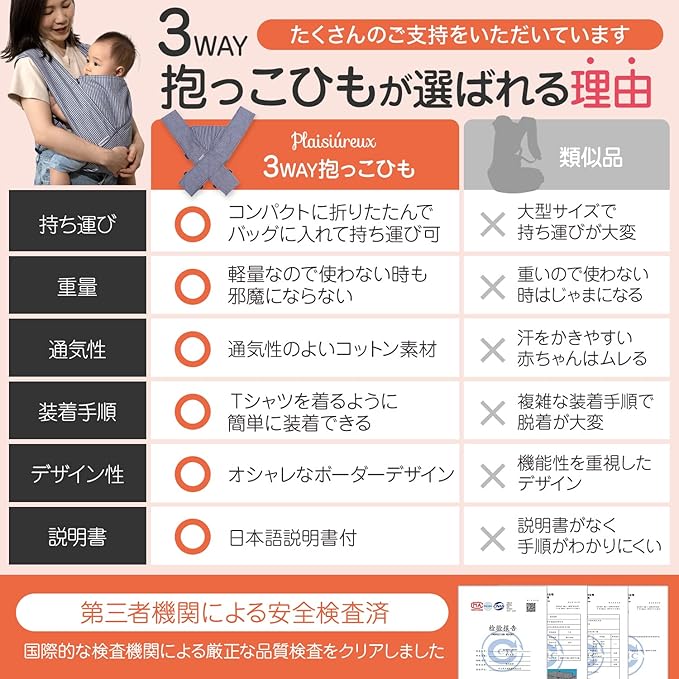 【簡単に装着でき負担が少ない】 Tシャツを着るように頭からかぶるだけで、1人で簡単に装着でき、簡単に赤ちゃんを抱っこひもに入れることができます。赤ちゃんが急に泣きだして抱っこしないといけなくなっても、場所を選ばずにすぐに抱っこできるので安心です。肩ひもは幅広の約11.5cm。肩に食い込むことがなく長時間の抱っこでも疲れにくい設計。背中までしっかりとヒモで覆うので、赤ちゃんの体重が分散されます。