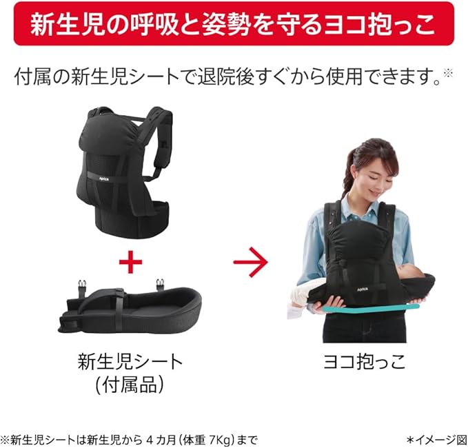 【備考】身長や体型によって装着できない場合もあります。ヨコ抱っこは付属の新生児シートをご使用ください。抱っこ時は、赤ちゃんを手で支えてください。おんぶの際は、赤ちゃんの様子に十分注意してください。