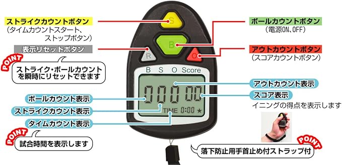 ボール、ストライク、アウトのスコアが一目で確認。大変見やすい超ワイド液晶文字。誤タッチしにくい形状とカラーボタンです。ネクストバッターが打席に入れば、リセットボタンで簡単スタートできます。タイムカウント機能で試合時間を管理可能。落下防止ストラップ付き。