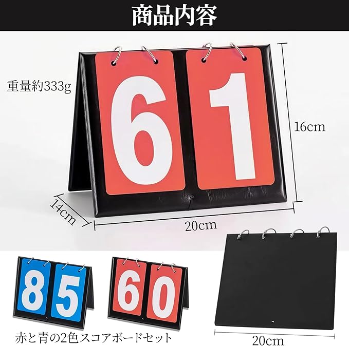【商品内容】赤と青の2色スコアボードセット。サイズは組立時20 14 16cm、収納時20 14 3cm、重量約333g。持ち運びやすく、収納にも便利なコンパクト設計です。