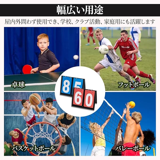 【幅広い用途】このスコアボードは、卓球、バレーボール、バドミントン、バスケットボール、サッカーなど多様なスポーツに対応。屋内外問わず使用でき、学校、クラブ活動、家庭用にも活躍します。