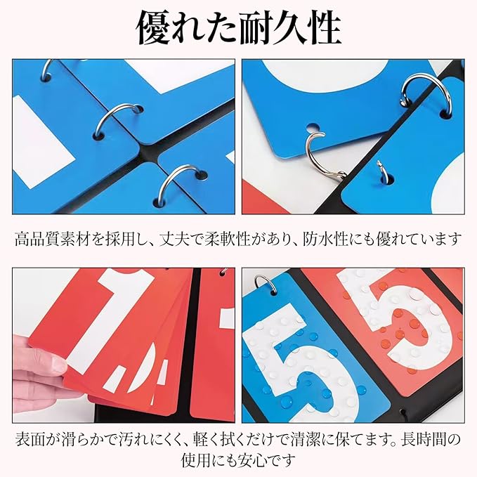 【商品内容】赤と青の2色スコアボードセット。サイズは組立時20 14 16cm、収納時20 14 3cm、重量約333g。持ち運びやすく、収納にも便利なコンパクト設計です。 【優れた耐久性】高品質素材を採用し、丈夫で柔軟性があり、防水性にも優れています。表面が滑らかで汚れにくく、軽く拭くだけで清潔に保てます。長時間の使用にも安心です。 【見やすいデザイン】大きくはっきりした白い数字と赤・青のコントラストカラーで、遠くからでもスコアをすぐに確認可能。印刷の鮮明さにより、どんな環境でもスコアが見やすくなっています。 【携帯性抜群】軽量設計で持ち運びがラクラク。折りたたみ式なので、使用後はスリムに収納でき、持ち運びや保管時に場所を取りません。屋外イベントにも最適です。 【幅広い用途】このスコアボードは、卓球、バレーボール、バドミントン、バスケットボール、サッカーなど多様なスポーツに対応。屋内外問わず使用でき、学校、クラブ活動、家庭用にも活躍します。