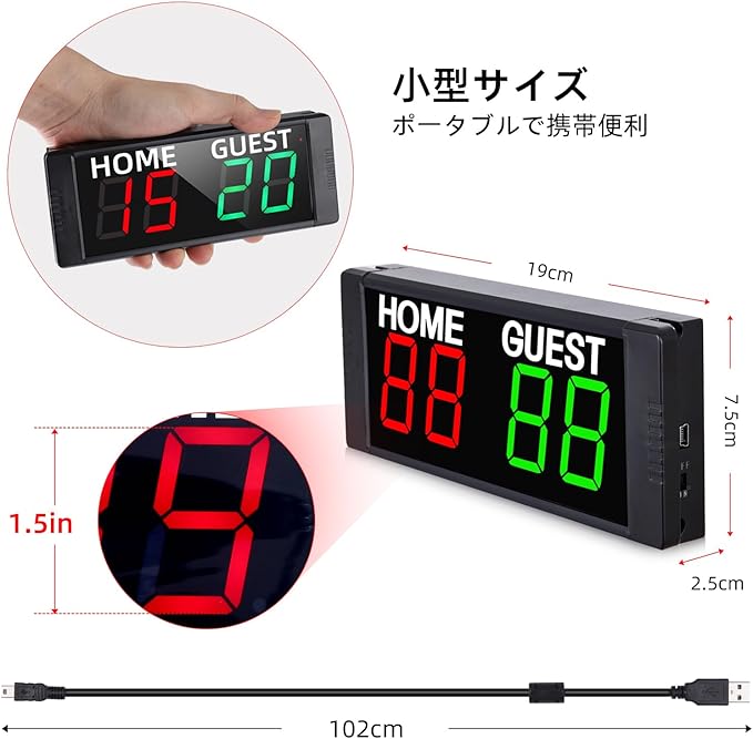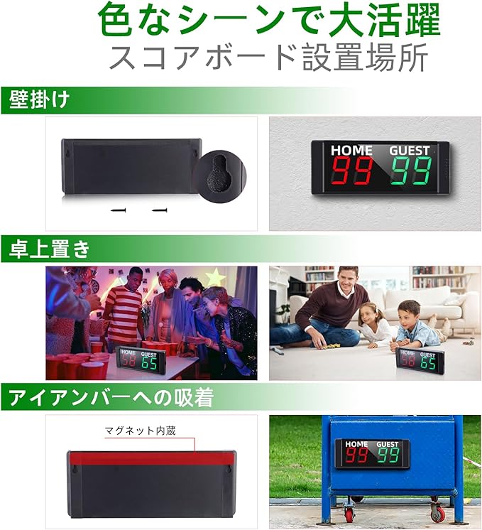 「マグネット&バッテリー内蔵」色ななシーンでも適合するために、このデジタルスコアボードはマグネットとバッテリーが内蔵されております。USB給電でケーブルの整理と電源探しなどの面倒を避けて、デジタルスコアボード本体を持ってば良いです。フル充電にして、およそ8時間使用できます。