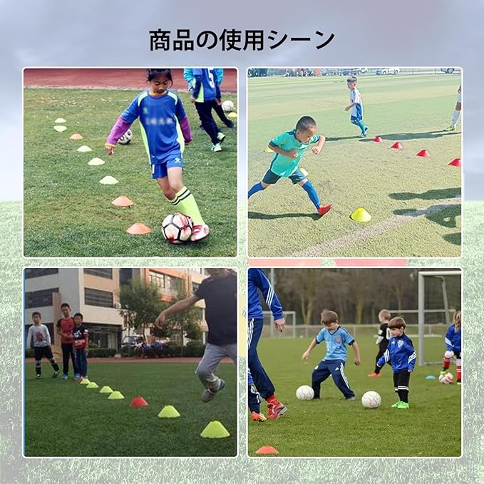 【幅広い用途】サッカーやフットサルトレーニングに不可欠なマーカーコーンですが、野球、陸上競技、インラインスケート、スケートボード、インラインスケート、オートバイ、自転車など、さまざまなスポーツで広く活用されています。