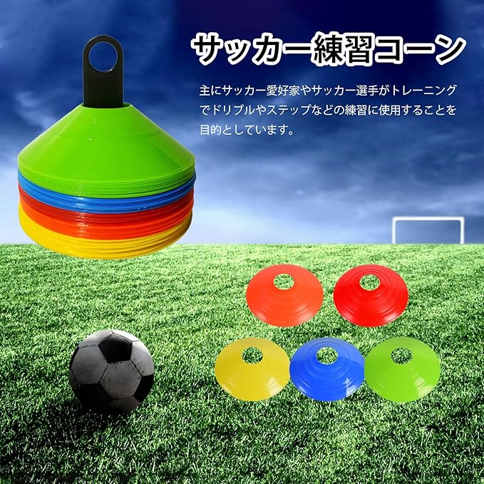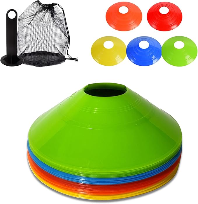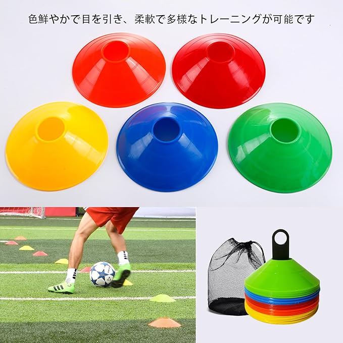 【鮮やかな色合いのセット】認識しやすいカラフルなサッカーアクセサリーセット(赤、橙、黄、緑、青)。ソフトグラウンドだけでなく様々なトレーニングや練習場にも適しており、夕方でもすぐに識別できる優れた視認性を誇ります。