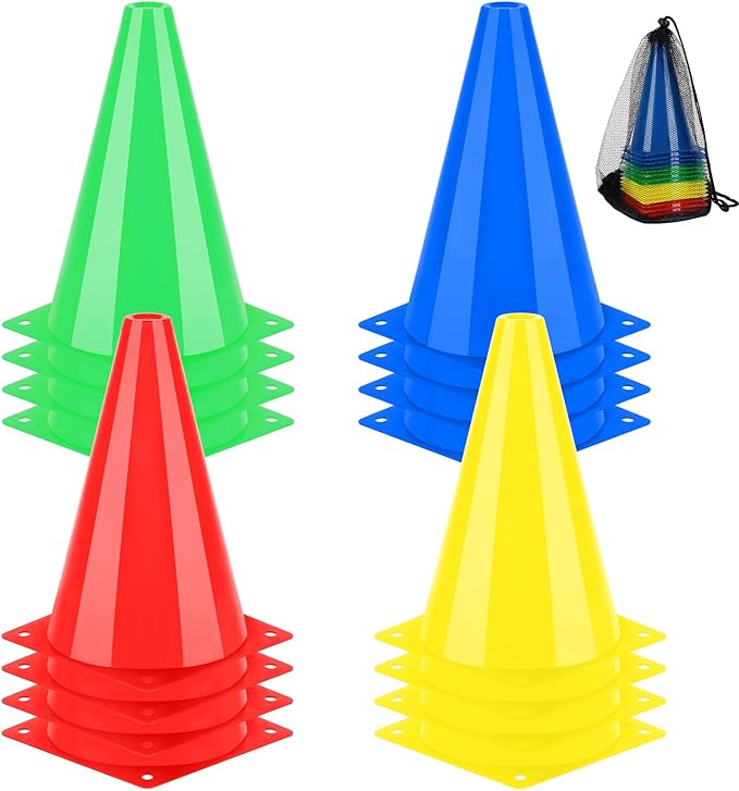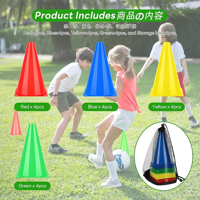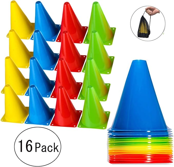 ✅製品は以下を含む:マーカーコーンx16個、袋x1個。(赤x4、青x4、緑x4、黄x4)