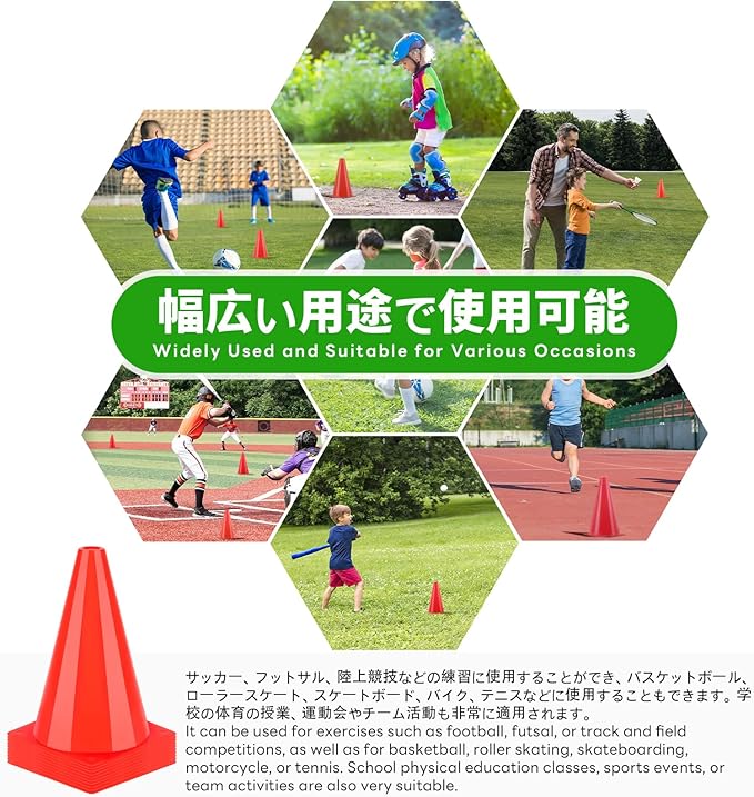 ✅カラーコーン ミニ用途が広い:サッカー、野球、テニス、陸上、ローラースケート、フットサルなどの各種スポーツに適用する。自転車やバイク、ドローンでの練習にも使えます。目標、距離、エッジ、境界マーカー、障害物、訓練速度、正確性、敏捷性を設定するために使用されます。学校、運動会、団体競技や部活の理想的な選択です。