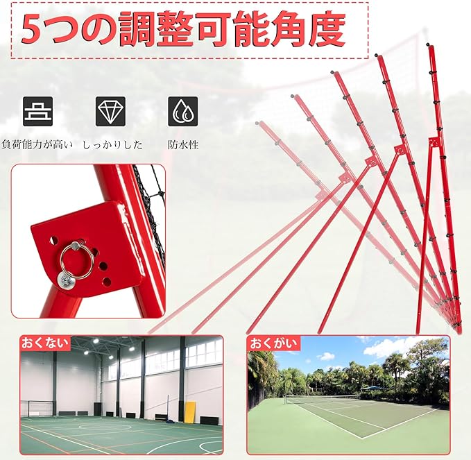 角度調整可能なデザイン:5つの角度設定、側面に5つの角度スイッチが装備されており、ネットの傾きを簡単に調整し、ボールの反発軌道と強度をカスタマイズできます。 5 番目の角度は折りたたみ収納用に特別に設計されており、ネットを平らに置いて簡単に収納でき、スペースを節約できます。
