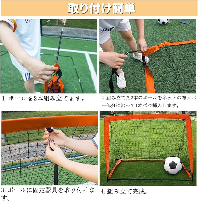 【丈夫な構造】耐久性に優れたグラスファイバーの骨組みと、高品質420Dのポリエステル製ネット素材を使用しています。付属のペグを使えば、強いシュートに対してもしっかりとゴールを固定でできます。