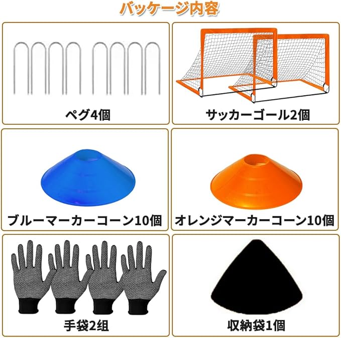 【商品詳細】サッカーゴールサイズ:120x90cm 重量(約): 1.5kg バッケージ:サッカーゴール1個、マーカーコーン10個(ブルー5個、オレンジ5個)、ペグ4個、収納袋1個、手袋1组