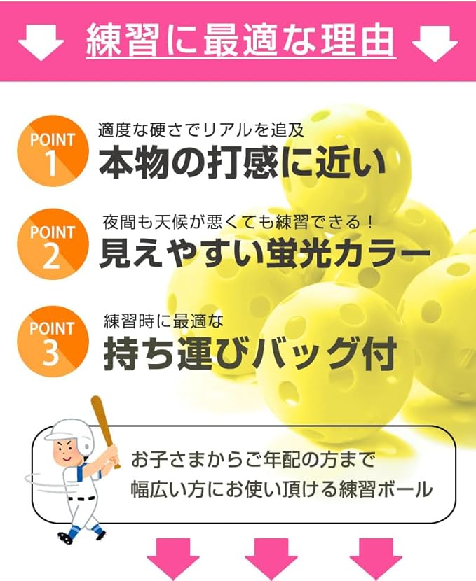 【野球 バッティング 練習用ボール】野球・ソフトボール用のトレーニングボールは、野外でご使用いただけますのでバッティング練習や試合前の打撃練習で使用可能です。