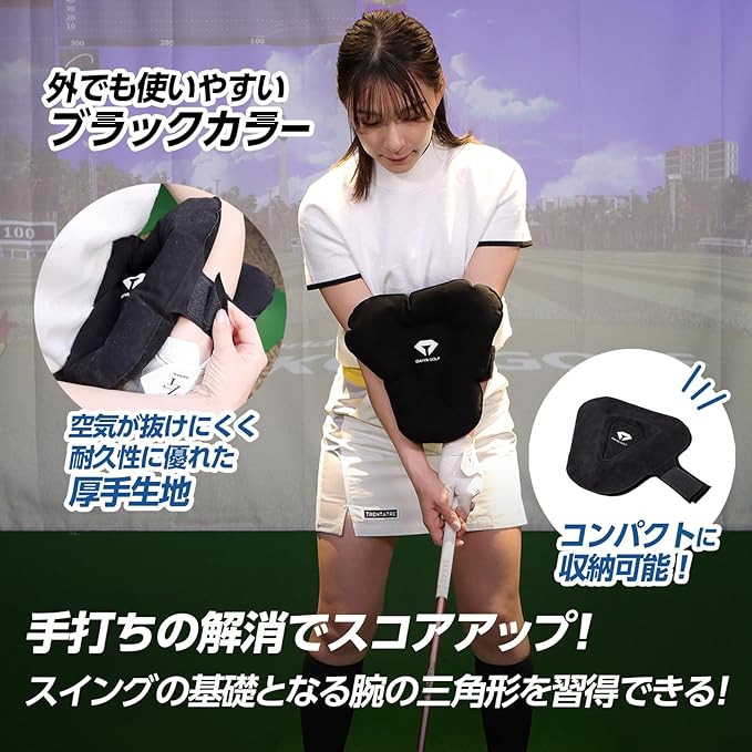 空気で膨らませた後に腕に装着して挟むだけで、スイングに大事な腕の三角形を自然と矯正したままスイングできます。