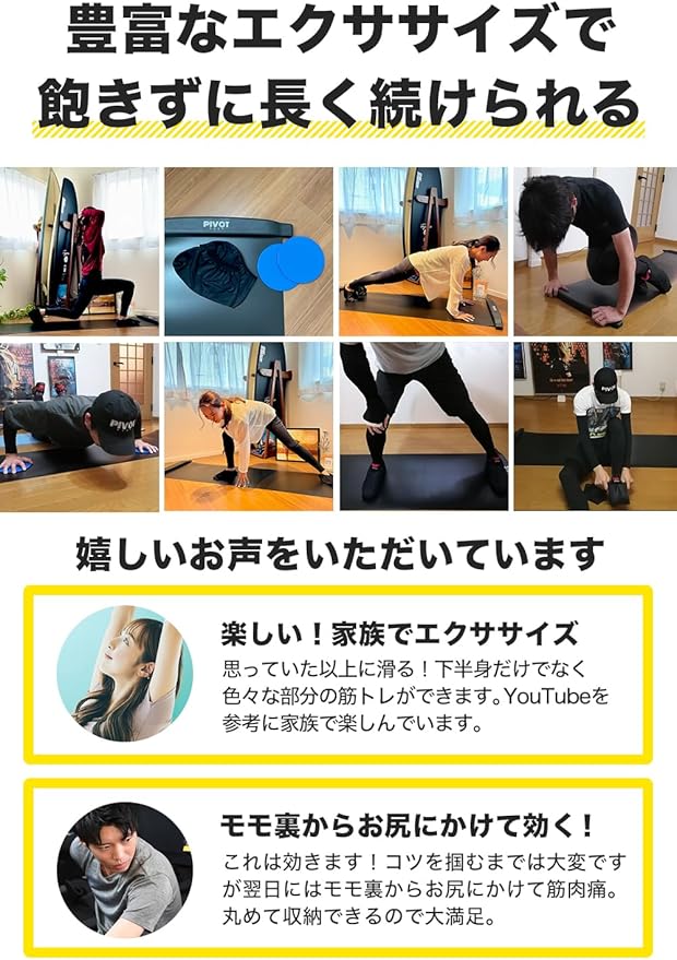 【スライドボード トレーニングとは】スライド ボード(スライディング ボード)は、もともとスピードスケートやアイスホッケー インラインスケートなどの選手が、相手よりも0.1秒でも前に出られるようにスケーティングの細かな動作を何度も確認・修正し理想のフォームを追求するためのスピードスケート トレーニング器具です。PIVOT-GEAR(ピボットギア)のスライドボードは、そんな究極を求めるスケート界のアスリートだけではなく、野球やサッカーの体幹トレーニング用品として使用されたり、太ももやおなか周りのシェイプアップや全身フィットネス、ダイエット器具 人気のエクササイズグッズとしてご利用いただけるよう持ち運びしやすく改良した商品です。