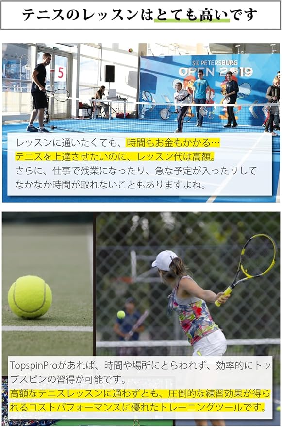 ⭕【TopSpinProのメリット】TopSpinProを使用すると、プロが打つ正しいトップスピンのフォームを覚えることができる。トップスピンを覚えると、・深いボールが打ちやすくなる。 ・相手から浅いボールを引き出しやすくなる。 ・主導権を取れるようになる。 ・どんな体勢でも手首で安全なボールを返すことが出来る。 テニスレッスン費以上の投資効果が期待できます。