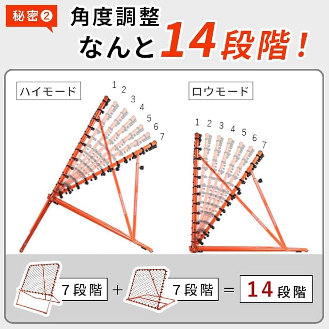 【角度・高さを細かく調整】 自然なパスを再現できる14段階構造。返球の角度は14段階、高さも自在に調整できるから、身長や練習目的に合わせたカスタマイズが可能。実戦のパス軌道に近い返球ができるため、よりリアルな練習が可能に。シュートまでの一連動作を繰り返すことで、試合勘もアップ!