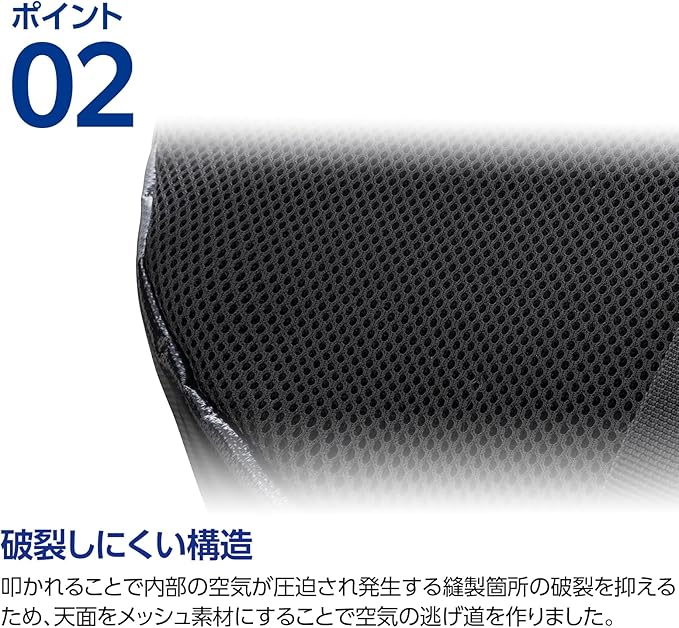 天面部がメッシュ構造で空気抜けが良く、空気圧による縫製破裂がしにくい構造です。
