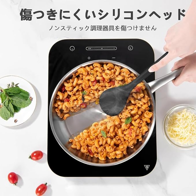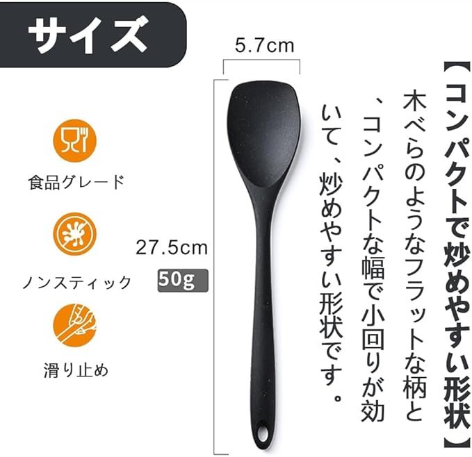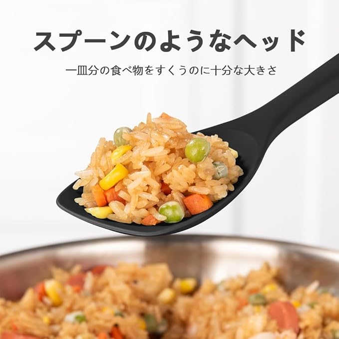 【柔らかい】鍋肌に沿ってしなるので、食材との間に入り受け止めやすい仕様です。 【ノンスティックフライパン】:シリコン製スプーンスパチュラの先端は柔らかいシリコン製で、焦げ付かないフライパンや鍋のコーティングに傷や損傷を与えません。 かき混ぜたり、混ぜたり、削ったりするのに最適なキッチンヘラです。 【コンパクトで炒めやすい形状】木べらのようなフラットな柄と、コンパクトな幅で小回りが効いて、炒めやすい形状です。一度にたくさん炒めるときも、操作しやすいちょうどいい長さ。 【軽快に炒める・混ぜる・よそう】浅めのスプーンで、内側に食材が残りにくい設計。一番深い位置を調整することで、すくいやすく、軽快に炒める・混ぜる・よそうの3つの作業がこれ一つでできます。 【お手入れ簡単】:ヘラは継ぎ目のないデザインで、食材やソースを引っ掛けません。 この調理用シリコーンスプーンは、お手入れが簡単で耐久性があります。 洗い流すか、食器洗い機に入れるだけで、毎回ピカピカになります。
