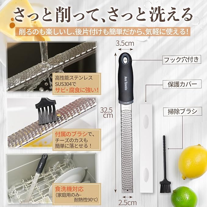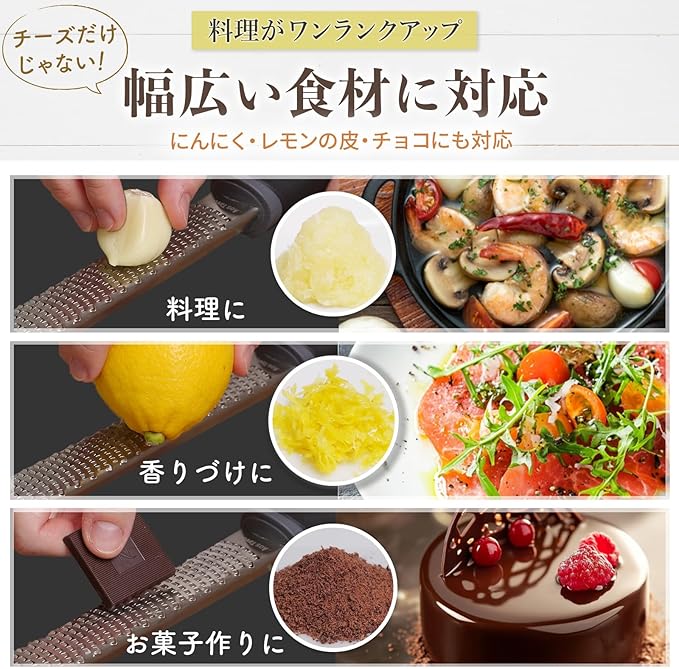 【様々なシーンで大活躍】チーズはもちろん、レモンの皮やニンニク、ナッツなども簡単におろせる多用途デザイン。さまざまな食材に対応し、料理の幅が広がる便利なキッチンアイテムです。