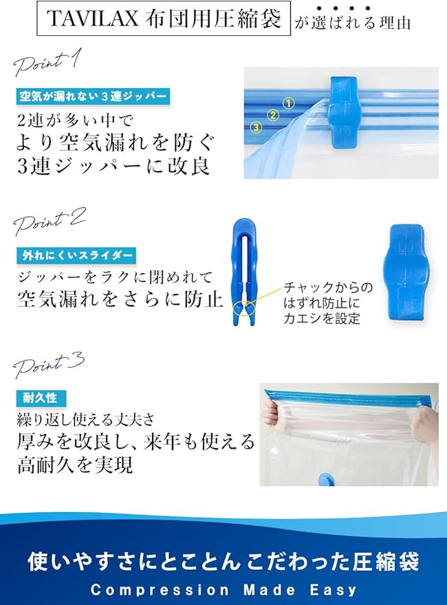 【長期間でも空気漏が漏れない】圧縮袋を使用した人の悩みで圧倒的に多いお声は、時間が経つと空気が混入してしまうこと。その悩みを解決する為に、TAVILAX独自で3連ジッパー仕様にしました。今までとは違う長期保管に優れた圧縮袋です。
