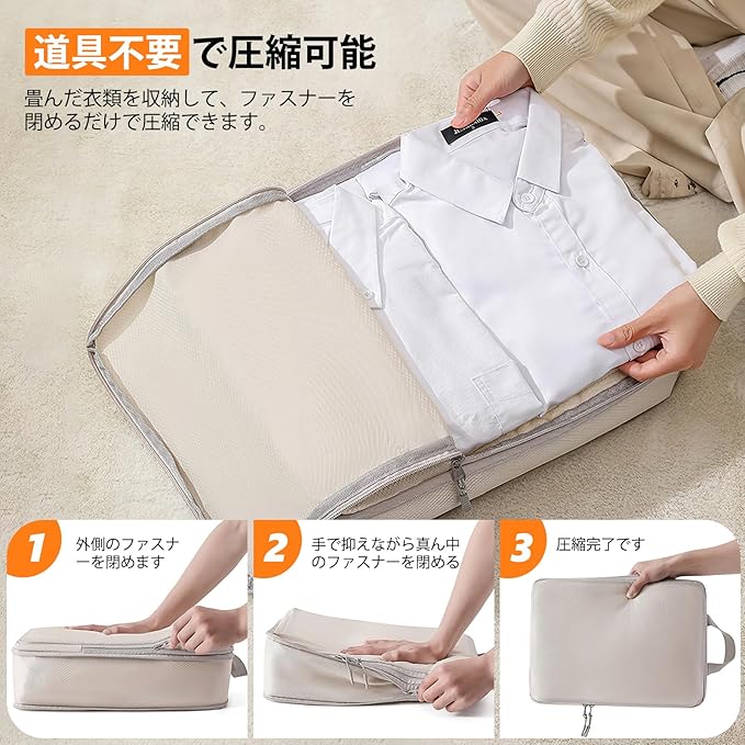 【簡単圧縮&50%スペース節約】圧縮用の吸引機などは不要で、ファスナーを閉めるだけで簡単に衣類を圧縮できるトラベルポーチです。2つの圧縮ジッパーを採用して、衣類スペースをより多く節約でき、約50%節約することができます!かさばる衣類や荷物を圧縮して、スーツケース内がすっきり整理整頓されます。