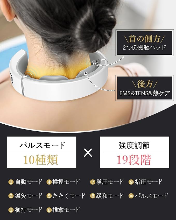 ネックケア 首 リラクゼーション器 ネックリラックス 2025新設計 両側振動パッド (EMS&TENSのW効果x加温 振動)母の日プレゼント 19段階強度調節 10種類モード 液晶ディスプレイ 日本語音声ガイダンス リラックスグッズ USB-C充電 静音 軽量 ギフト 敬老の日 誕生日プレゼント 新年プレゼント 母の日 父の日 お祝い 男女兼用 日本語説明書を同梱