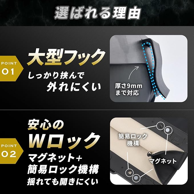 【倒れない& 幅広い車種対応】専用設計の大型フックは、ポケット厚さ9mmまで対応、幅広い車種に取り付け可能・しっかり掴む構造で、カーブや振動での転倒の心配なし(※フックでポケット生地をしっかり挟み込んで固定のこと)