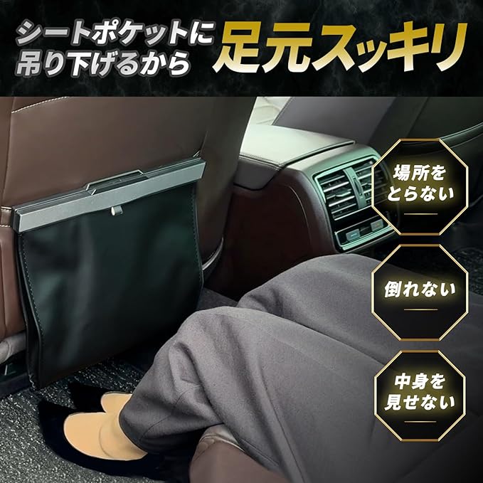 【スマート設置】シートポケットに引っ掛けるタイプだから、フロアスペースは広々キープ、乗り降りもスムーズ、足元を邪魔しないスリム設計が特徴