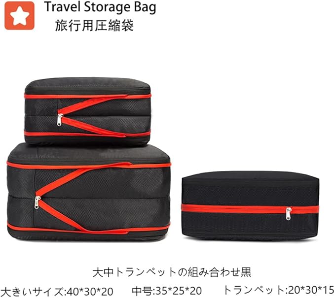 旅行用圧縮袋 トラベルポーチ 3点セット 可変スペース 圧縮で衣類スペース約50%節約 防水 乾湿分離 軽量 衣類収納 便利グッズ 出張 旅行 (ブラック)