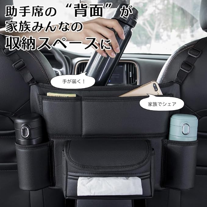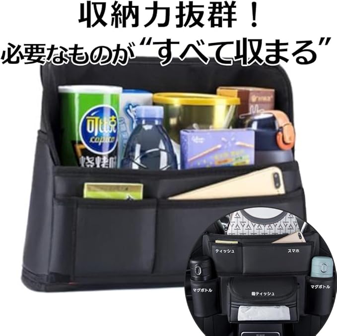 【多機能ポケットで小物をまとめて整理】スマホ・タブレット・ノート・お菓子・充電ケーブルなどの車内の散らかりやすいアイテムを一括収納。車中泊やレジャー、長距離移動にも便利です。