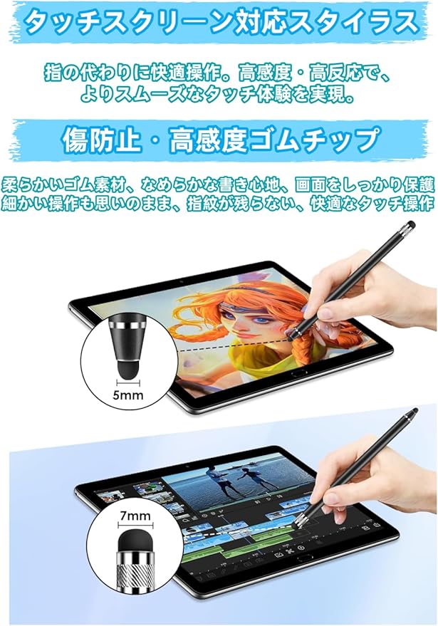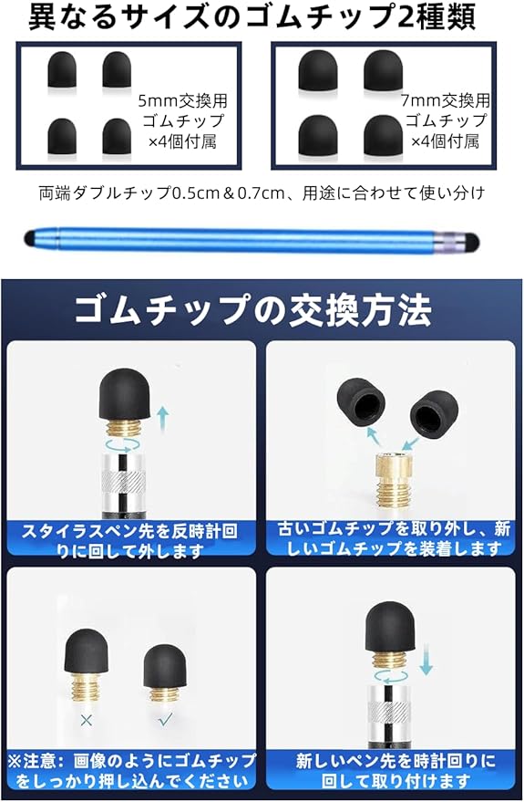 ✅【交換用チップ付きで長く使える】両端のゴムチップは簡単に取り外し・交換可能。工具不要で数秒で交換できます。セット内容はスタイラス2本と交換用チップ8個(0.5cm 4、0.7cm 4)を含みます。