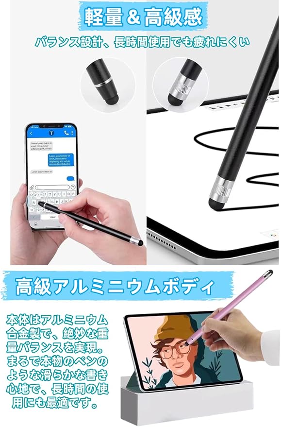 ✅【2-in-1 デザインで便利】1本でラバーチップとディスクチップの2種類の使用感を体験可能。軽量アルミ素材で、充電や接続不要ですぐに使用でき、快適で耐久性も高い設計です。
