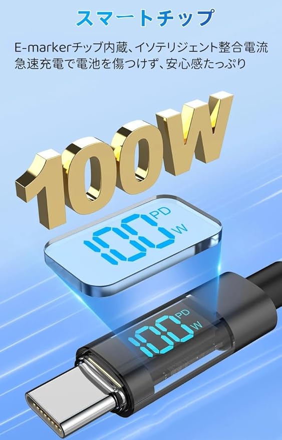 【E-marker スマートチップ】内蔵チップは、常に 充電電力を監視し、電流と電圧を自動的に調整して、不安定な 電流によるバッテリーの損傷を防ぎます。最も安全な100W急速充電のための最先端のスマートチップ。