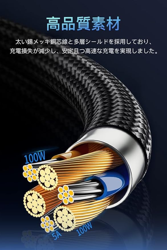 【100W超高速電力供給&高速データ転送】7A大電流、PD(PowerDelivery)充電に対応し最高100Wでの急速充電が可能です。 携帯電話、タ ブレット、ラップトップ、パワーバンクなどでの急速充電。MacBook Pro13 ''を2.5時間でフル充電します。USB2.0準拠で480Mbpsでのデータ転送が可能。PC、タブレット、スマートフォン間などでの写真転送が迅速に行えます。