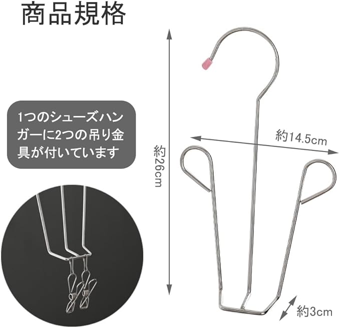 1.セット内容:2本セット(1つのシューズハンガーに2つの吊り金具が付いています)。サイズ:約26*14.5*3cm。