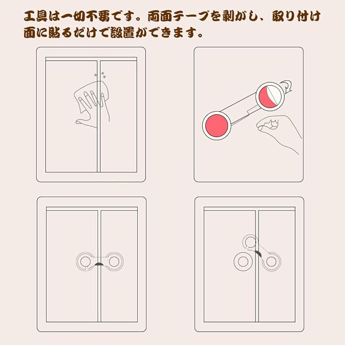 ★取付けも簡単:1. 設置したい位置をキレイに拭いて。 2. 裏面の粘着テープの剥離紙を剥がします。 3. 取り付け面に貼り付けます。 4. 40秒以上押さえつけて、24時間程テープを剥がす方向に力が加わらないよう置いておくのがおすすめです。 5. 粘着タイプなので剥がす時にはドライヤーで温めながら慎重に剥がす必要がある。【注意】ノブの下が平面で無いとしっかり貼り付けられません。