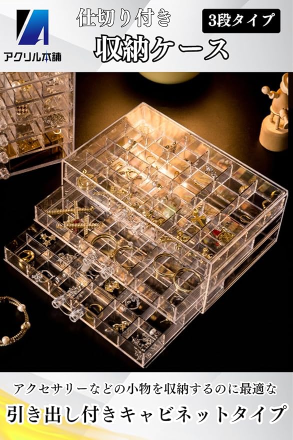 【仕切り付き収納ケース】アクセサリーなどの小物を収納するのに最適な引き出し付きキャビネットタイプ
