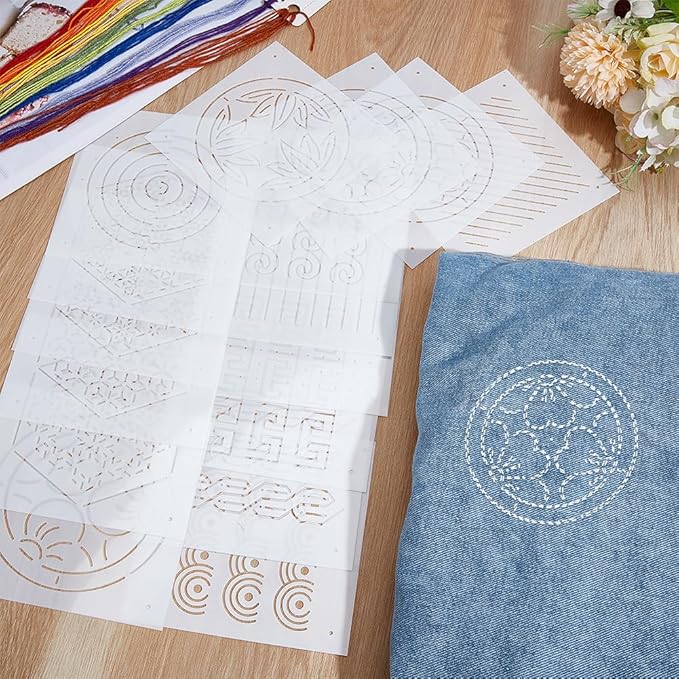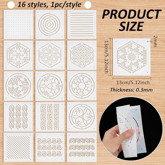 BENECREAT 16枚 刺繍ステンシル 13x13cm 厚さ0.3mm 刺し子ステンシル 点と糸・六角形・日本風パターンなど16スタイル PET 描画線テンプレート 刺し子テンプレート 刺繍ツール ハンドキルティング用