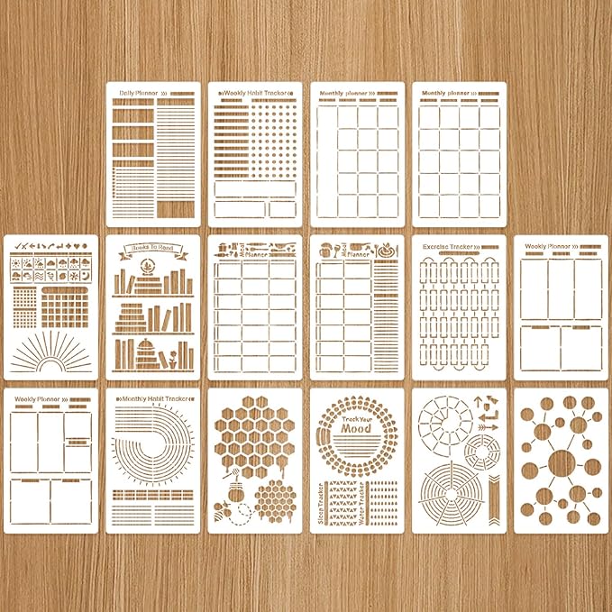 ジャーナルステンシルセット【16個セット】プラスチック製 再利用可能 DIYプランナーテンプレート 週刊誌 日記 手帳に最適 スケジュール ドローイング 20cm*13cm